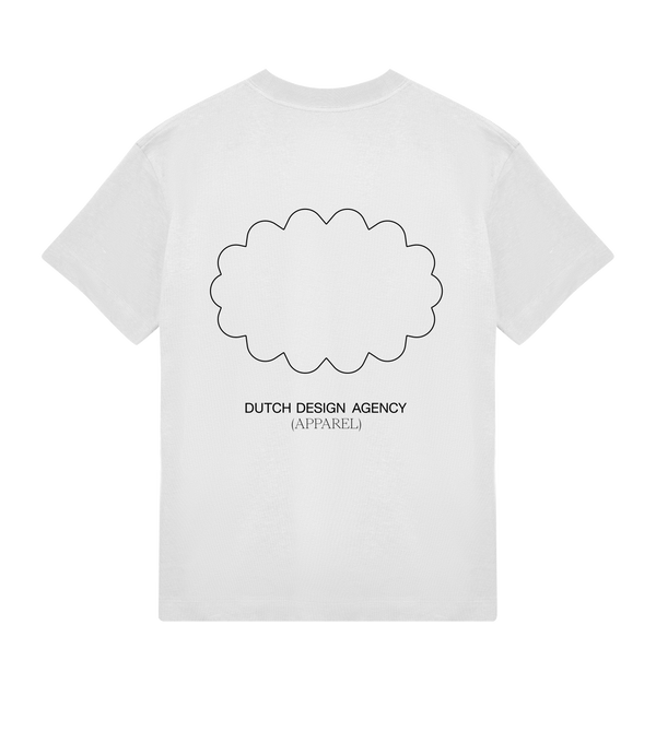 A white short sleeve tee, crafted from heavy organic cotton. It features printed artwork on the back. Designed with an oversized, boxy fit and a high, chunky ribbed crewneck. This shirt is always a good choice for casual days.