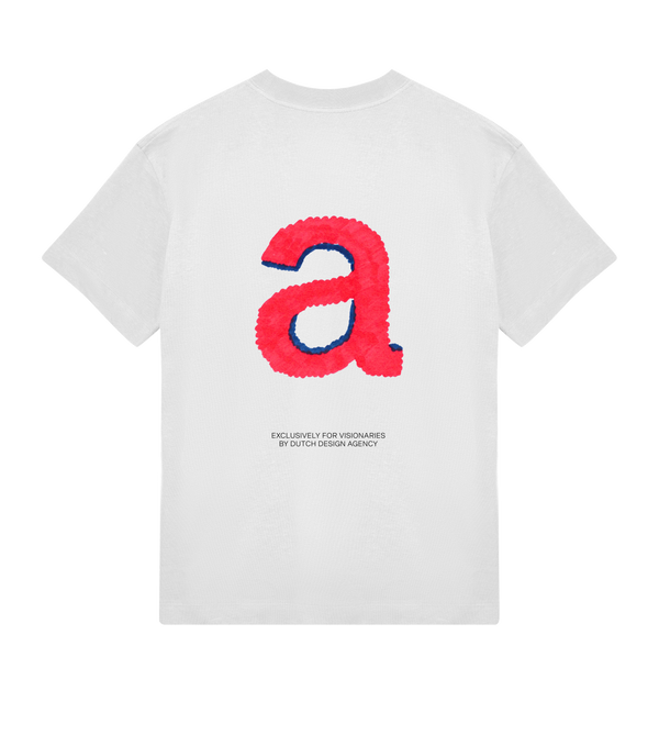 A white short sleeve tee, crafted from heavy organic cotton. It features an red ‘a’ graphic on the back and our logo on the chest. Designed with an oversized, boxy fit and a high, chunky crewneck rib. This tee is exclusively made for visionaries.