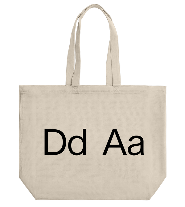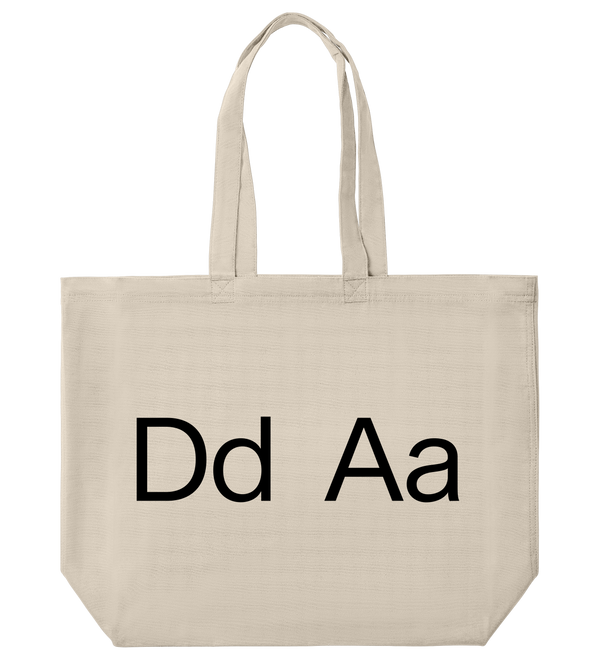 A timeless white tote bag with a ‘Dd Aa’ text, designed with a structured bottom panel, two cotton canvas handles, unlined and open at the top. It includes an inside pocket with a metal press-button closure. The perfect everyday essential.