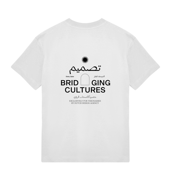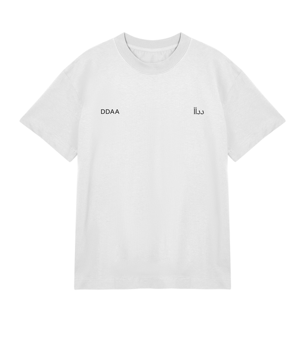 A exclusive white short-sleeve tee, crafted from heavy organic cotton. It features printed artwork on the back and our logo in both English and Arabic on the front. Designed with an oversized, boxy fit and a high, chunky ribbed crewneck. This tee is made exclusively for visionaries.