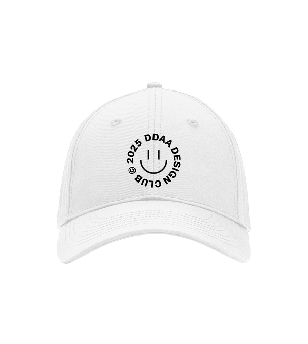 Join the club with our baseball cap in white. Crafted from durable organic cotton twill. It features a sturdy brim, stitched eyelets and velcro size adjustment. With a structured feel and fine single-needle topstitching. It features a smiley with ‘DDAA Design Club’.