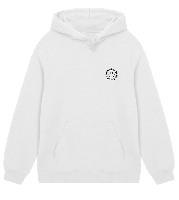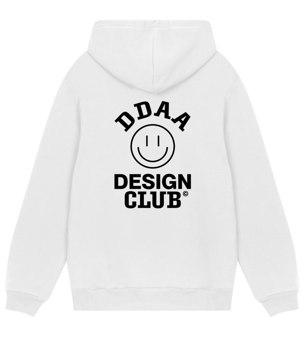 Join the club with our white regular hoodie, made from organic cotton and recycled polyester. It features a smiley with ‘DDAA Design Club’ on the back and on the chest. Designed with a kangaroo pocket, a true-to-size fit, a double-layered hood with drawstrings, finished with ribbed cuffs and hem.