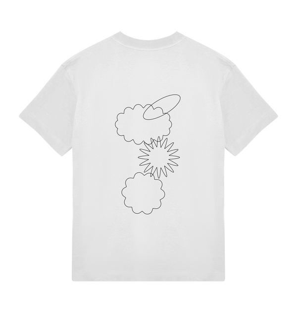A white short sleeve tee, crafted from heavy organic cotton. It features printed artwork on the back. Designed with an oversized, boxy fit and a high, chunky ribbed crewneck. This shirt is always a good choice for casual days.