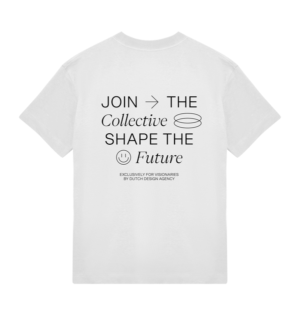 A white short sleeve tee, crafted from heavy organic cotton. It features a 'Join the future' graphic on the back. Designed with an oversized, boxy fit and a high, chunky crewneck rib. This tee is exclusively made for visionaries.